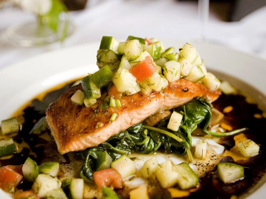 Finas laminas de salmón con alcaparras, queso parmesano y dressing de pica